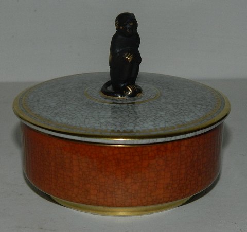Skål med låg fra Royal Copenhagen. Skålen dækket af rødkrakeleret glasur. Gråt låg med figur af abe som lågknop. I perfekt stand. 1. sortering. 7½ cm høj. Fabriksmærket på bunden.