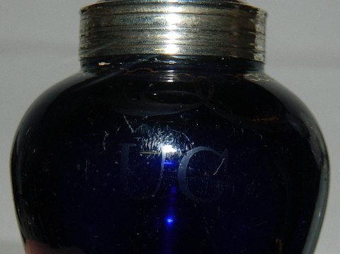 Sukkerbøtte i glas med låg i sølvplet. Rester af gulddekoration på glasset med teksten "SUGAR". Guldet på bogstaverne er dog bortvasket, men teksten anes stadigvæk. Glasset er usædvanligt tungt. I god stand uden skader eller reparationer. Fremstillet midt i 19. århundrede. 12 cm høj.