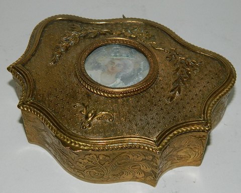 Fransk dåse i metal. Dekoreret med malet portræt af kvinde med hat bag glas. I god stand uden skader. Påstemplet "FRANCE" på bagsiden. 4½ cm høj - 11½ cm lang og 10½ cm bred.