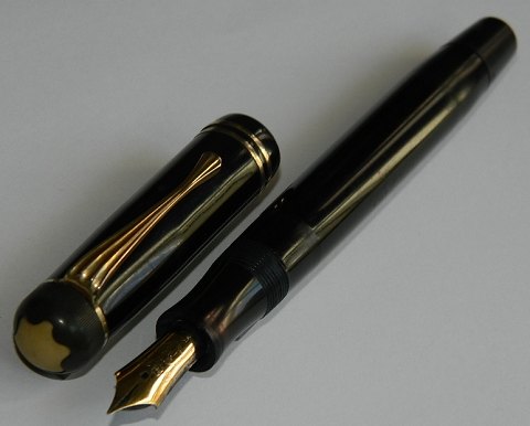Sort Montblanc Masterpiece 30 fyldepen fra omkring 1930. Fremstår i perfekt stand med samtlige originale dele. Ny gummisæk skal indsættes før end den fungerer igen. Uden nævneværdigt brugsslid. Dybe indprint på både hætte og "krop". Smuk ben-hvid stjerne på toppen af hætten. Original Montblanc spids indgraveret 4810 (højden på bjerget Mont Blanc). 13½ cm lang. LIGNENDE KØBES