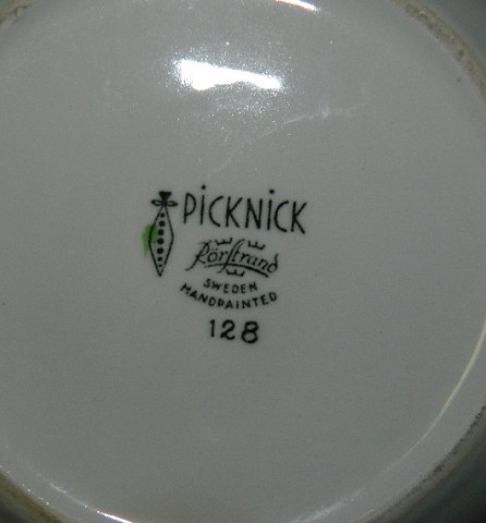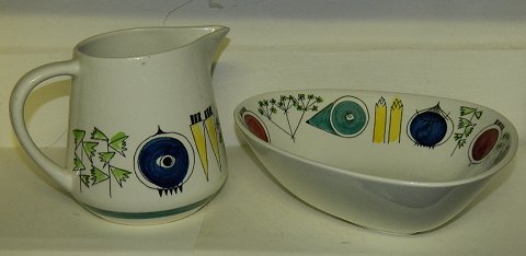 Picknick jordbærsæt, kande og skål, fra svenske Rörstrand. Fremstår i god stand uden skader eller reparationer. Begge dele fabriksmærkede. Kanden er 13½ cm høj og skålen er 7 cm høj.