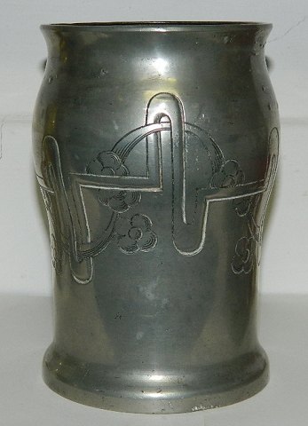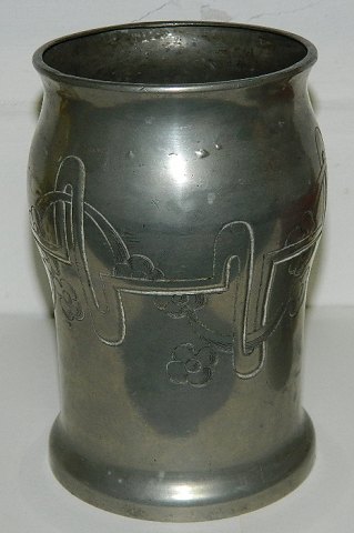 Vase i tin fra omkring 1900. Dekoreret i skønvirkestil. Fremstillet hos Mogens Ballin (1871-1914) på hans eget værksted. Ingen skader eller reparationer. Fabriksmærket med MB uden modelnummer.