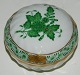 Lågskål i porcelæn fra Herend, Ungarn. Dekoreret med grønne blomster samt gulddekoration på låget. Fremstår i perfekt stand. Fabriksmærket på bunden. 4 cm høj og 6½ cm i diameter.