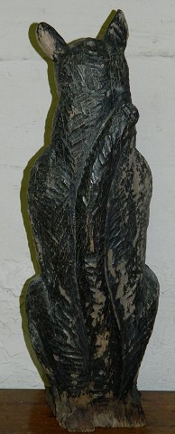 Black painted hand-carved figure of cat in wood. Made around 1860-80. Damagde on the base. Corner of this is gone - many years ago. Stand still fine as seen in the photograph. Country of origin is unknown but suspected of being cut in Scandinavia. 41 cm high.
