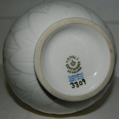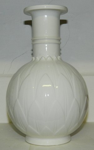 Vase i porcelæn af Arno Malinowski for Royal Copenhagen. Dekoreret med bladværk i relief. Kgl. 3309. Signeret med monogram. 2. sortering. Mindre "sandkorn" ses under glasuren på toppens overflade. 20 cm høj.