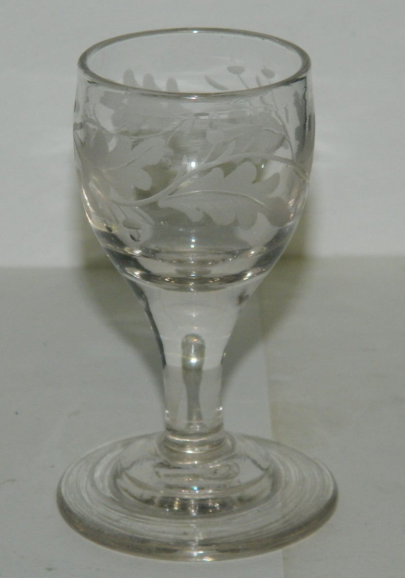 Gammelt snapseglas med egeløvsslibing 19. århundrede.