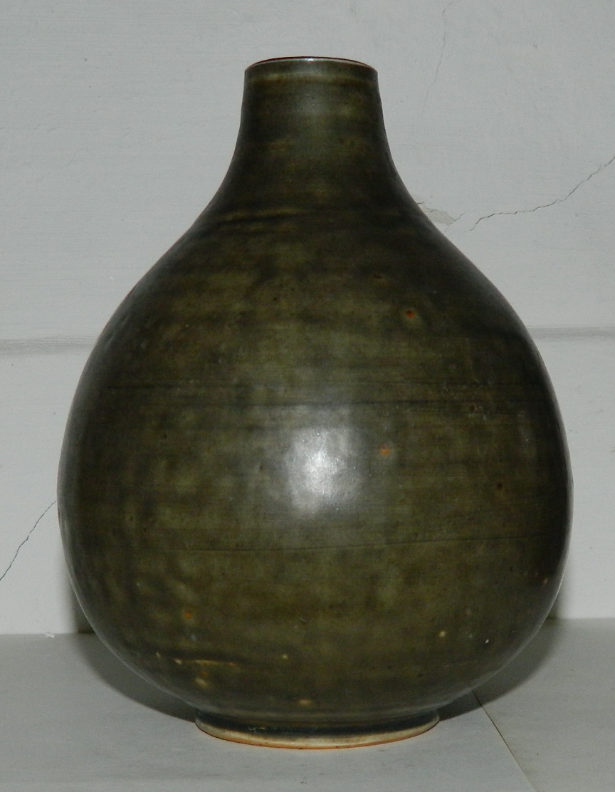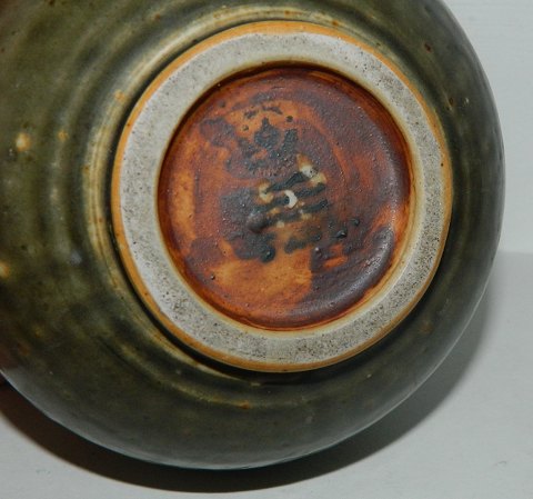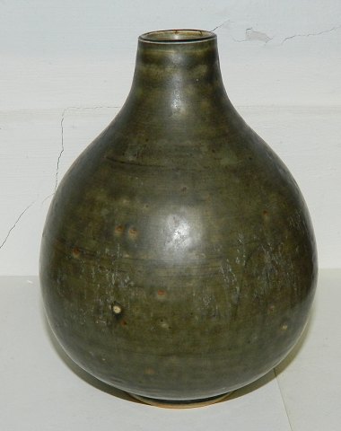 Dråbeformet vase i stentøj fra Royal Copenhagen. Dækket af grøn glasur. 2. sortering. Har flere små lyse pletter samt hvid knop på siden. Ingen skader eller reparationer. 15½ cm høj.