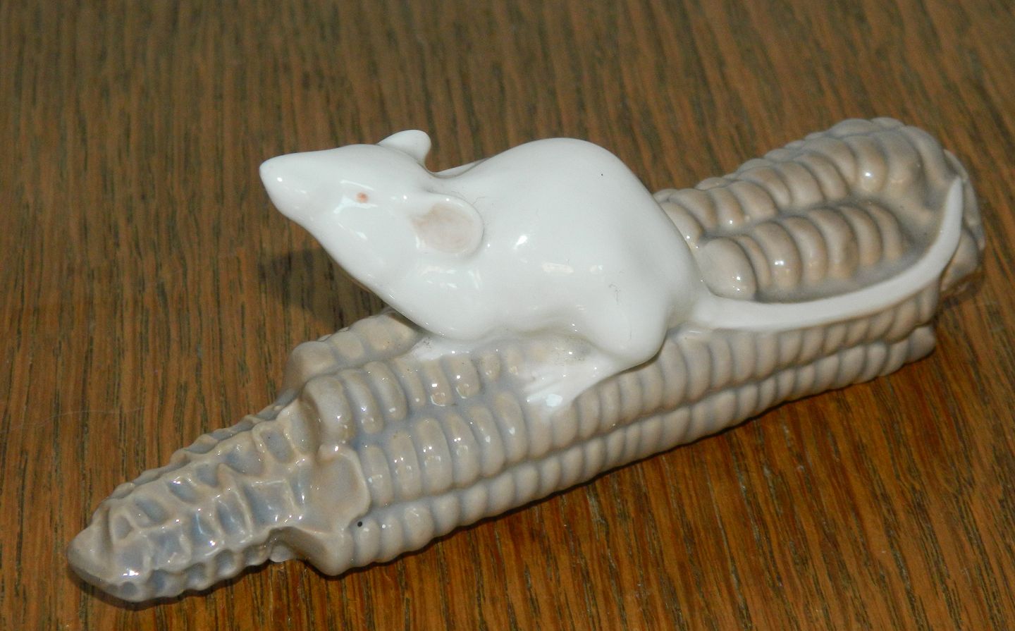 Figur af mus på majskolbe i porcelæn fra Royal Copenhagen. 1. sortering. Modelnummer 512. Fremstår i perfekt stand. 5 cm høj og 13 cm lang.