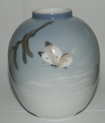 Vase i porcelæn fra Royal Copenhagen. Dekoreret med sommerfugle. Fremstillet omkring 1935. Fremstår i perfekt stand. 1. sortering. Fabriksmærket på bunden. 12½ cm høj
