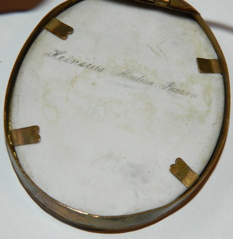 Portræt af ung kvinde. Malet på porcelæn i begyndelsen af 19. århundrede. På bagsiden Heinsius : Madam Bazin eller Razin. Sidder i bronzeramme. Fremstår i god stand uden skader eller reparationer. Mål: 9 cm høj og 7 cm bred.