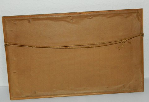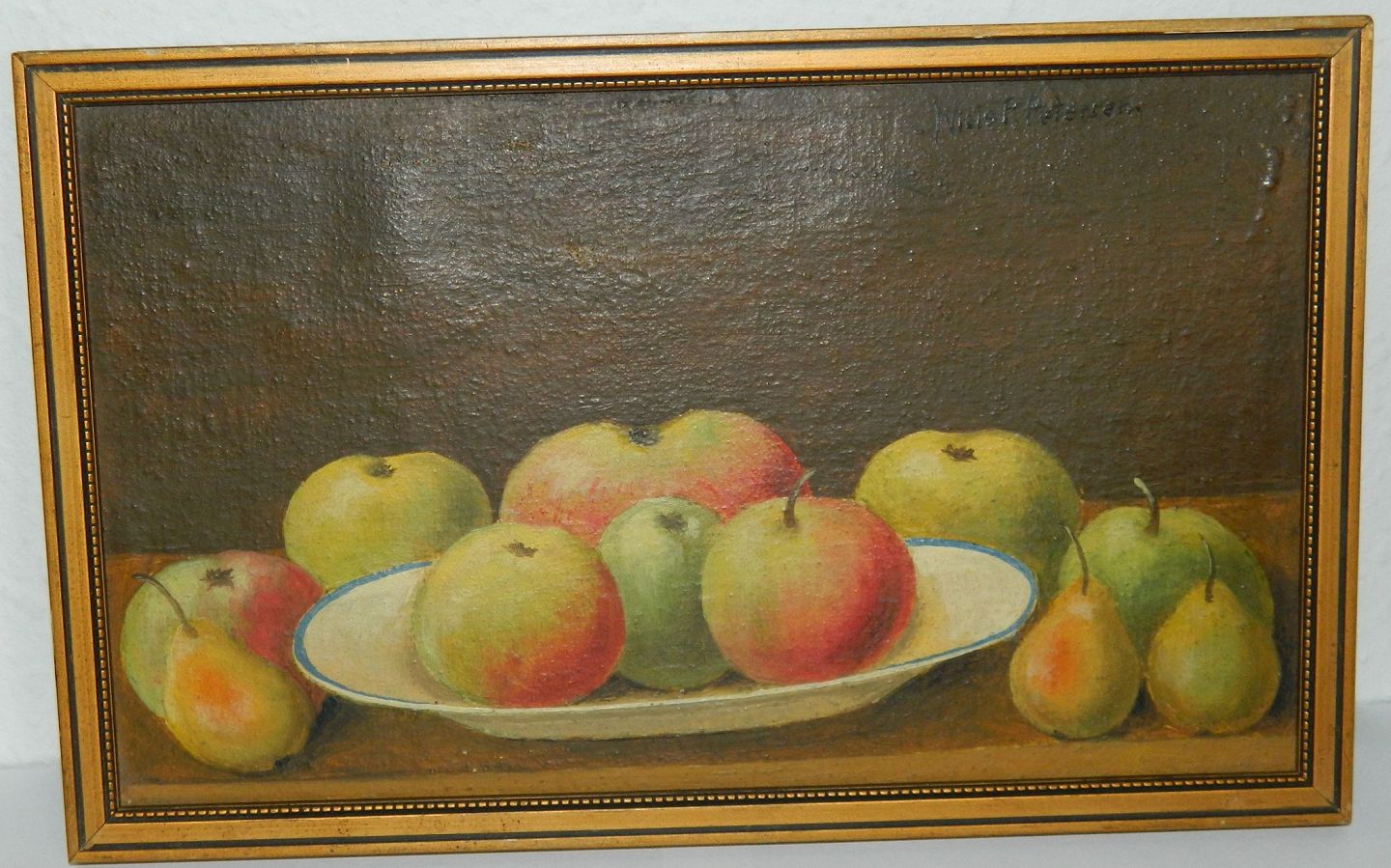 Maleri med æbler og pærer delvist på tallerken. Malet på lærred opklæbet på karton. Fremstår i god stand. Signeret af Niels P. Petersen omkring 1920. Mål: 19 cm x 29½ cm.