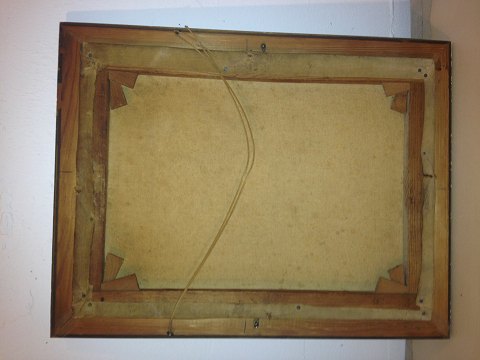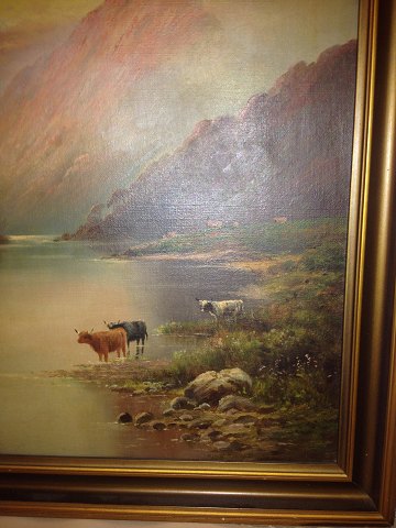 Oliemaleri på lærred. Motiv med køer i forgrunden samt bjerge i baggrunden. Signeret Clement Adams. Overflade samt lærred og rammen i god stand uden skader eller reparationer. Rammens mål: 36 cm x 46 cm
