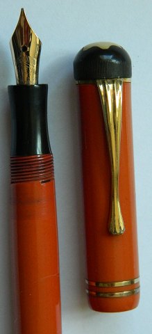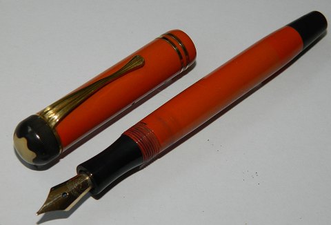 Kraftig Montblanc Masterpiece nr. 30 fyldepen. Fremstår i god stand med almindeligt brugsslid. Smuk aldersrelateret patina på overfladen. Hætte mærket 4810 MONTBLANC MASTERPIECE. Kroppen mærket SIMPLO ORIGINAL MONTBLANC. Spidsen mærket 4810 M samt 14C (14 karat guld). Bundskruen mærket 30 samt EF. Den store stjerne er benhvid ! 13½ cm lang. Der skal indsættes ny gummisæk før end fyldepennen fungerer igen. LIGNENDE FYLDEPEN KØBES