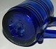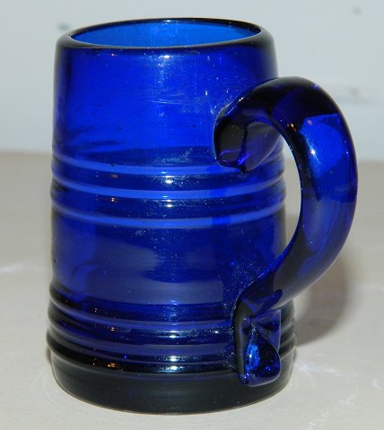 Blåt børneglas eller punchglas med hank fra sidste halvdel af 19. århundrede. Fremstår i god stand uden skader eller reparationer. Vertikale bånd rund om kruset. "Navlemærket" på undersiden. 7 cm højt.