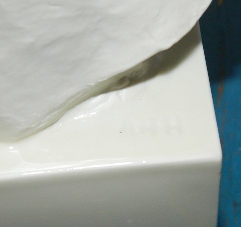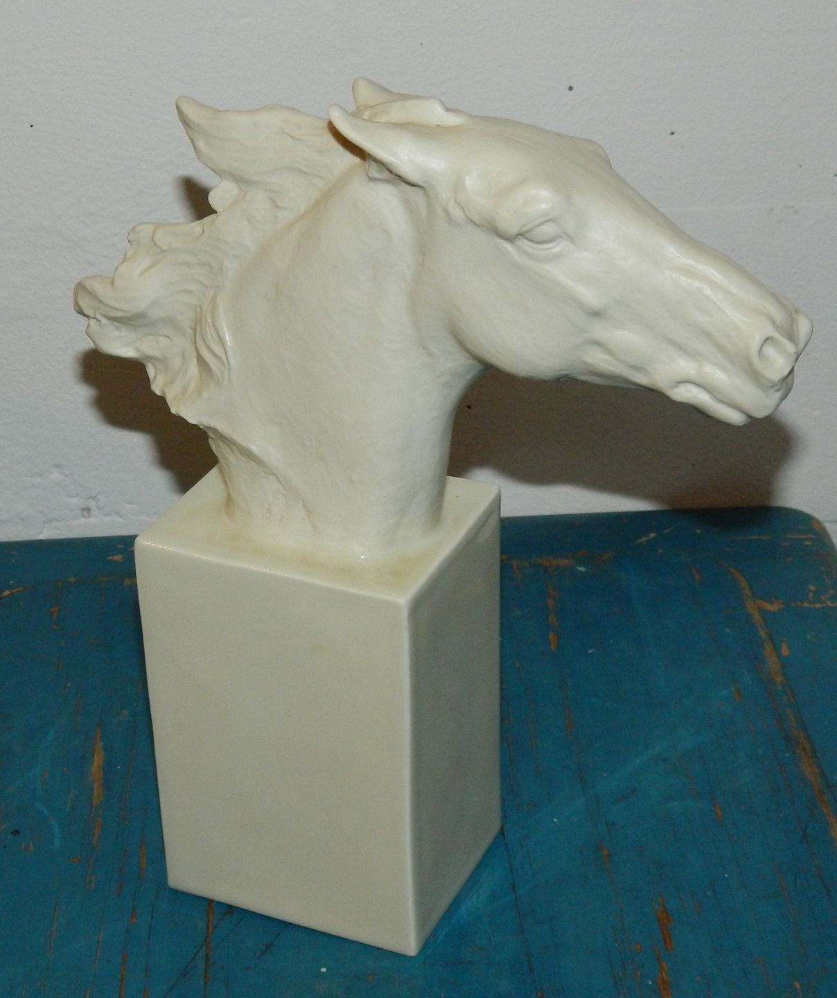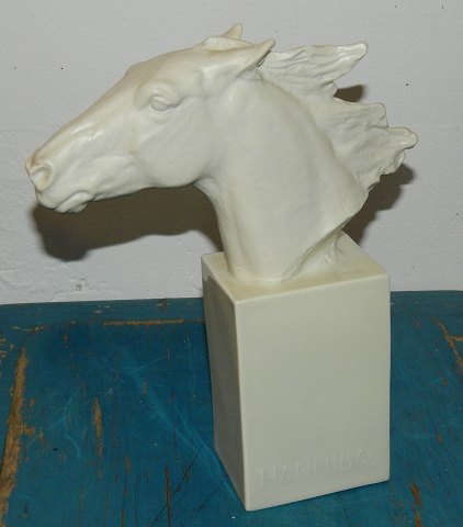 Buste af hest på sokkel i porcelæn. Designet af Th. Karner for Rosenthal, Tyskland. På én side påtrykt HANNIBAL i relief. Figuren fremstår i perfekt stand uden skader eller reparationer. Fabriksmærket på bunden. 23 cm høj.