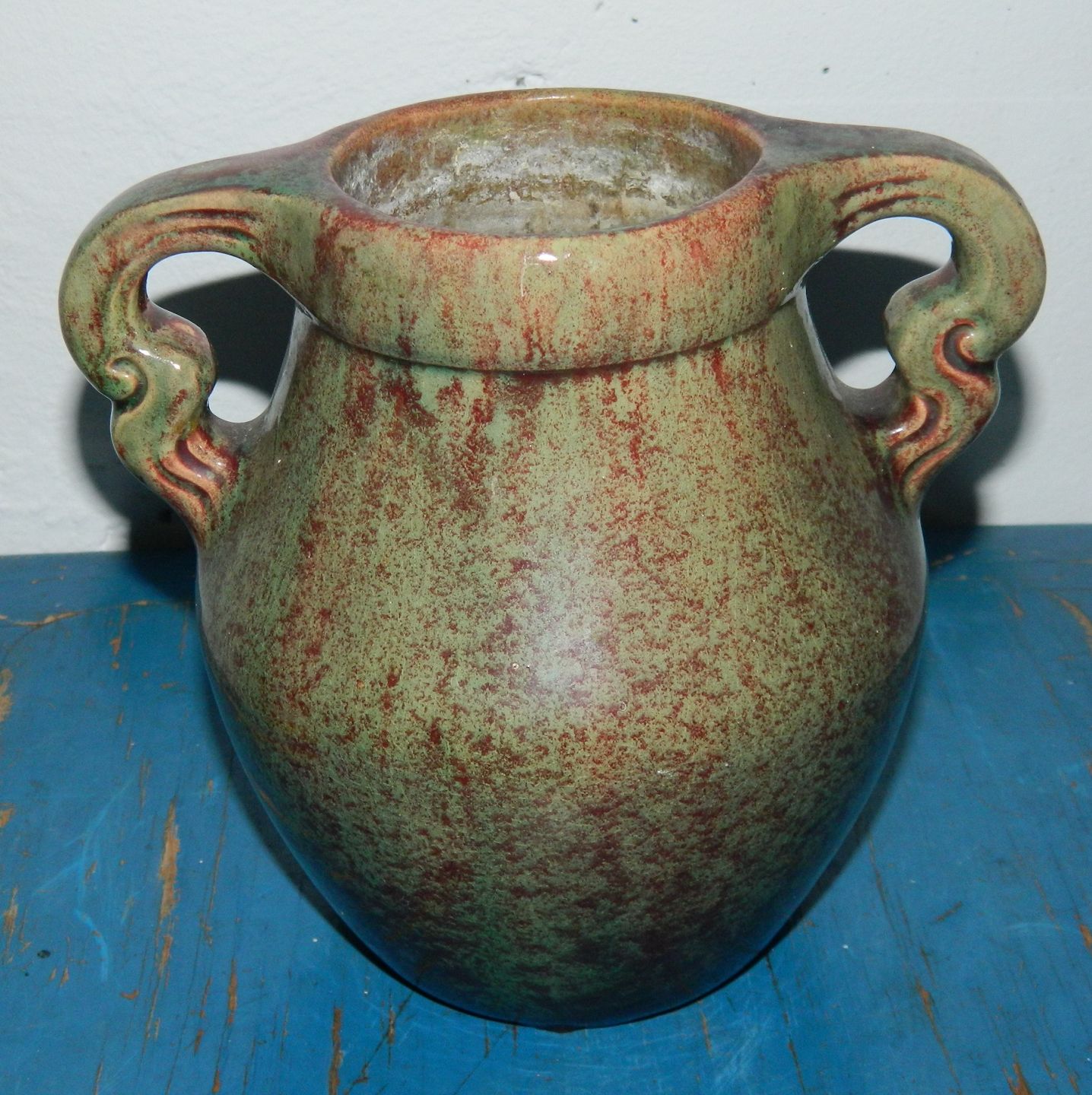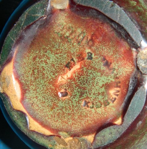 Krukke i keramik fra Michael Andersen & Søn fremstillet for Københavnske C. V. Kjær omkring 1900. Dekoreret i Skønvirkestil og er lidt usædvanlig i farve og form ! Fremstår i god stand uden skader eller reparationer. Mærket C. V. Kjær Kjøbenhavn på bunden. Krukken er 16 cm høj.