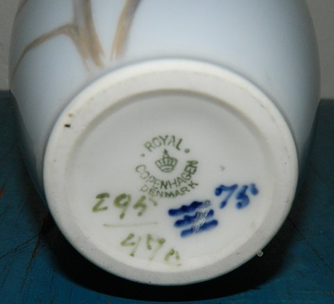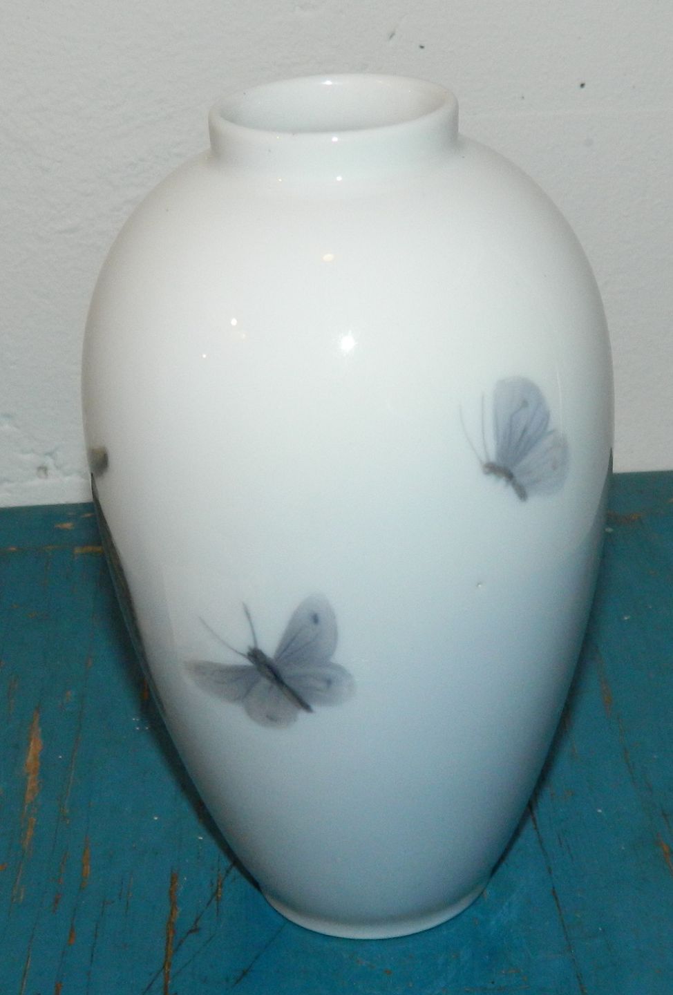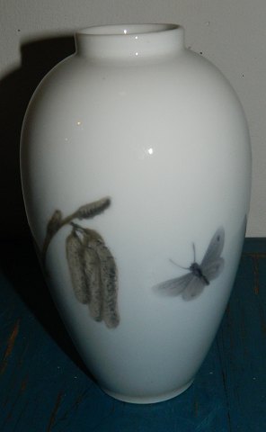 Vase i porcelæn fra Royal Copenhagen. Fremstillet mellem 1923-1935. Dekoreret med et par sommerfugle. Fremstår i god stand uden skader eller reparationer. 2. sortering. 17 cm høj.
