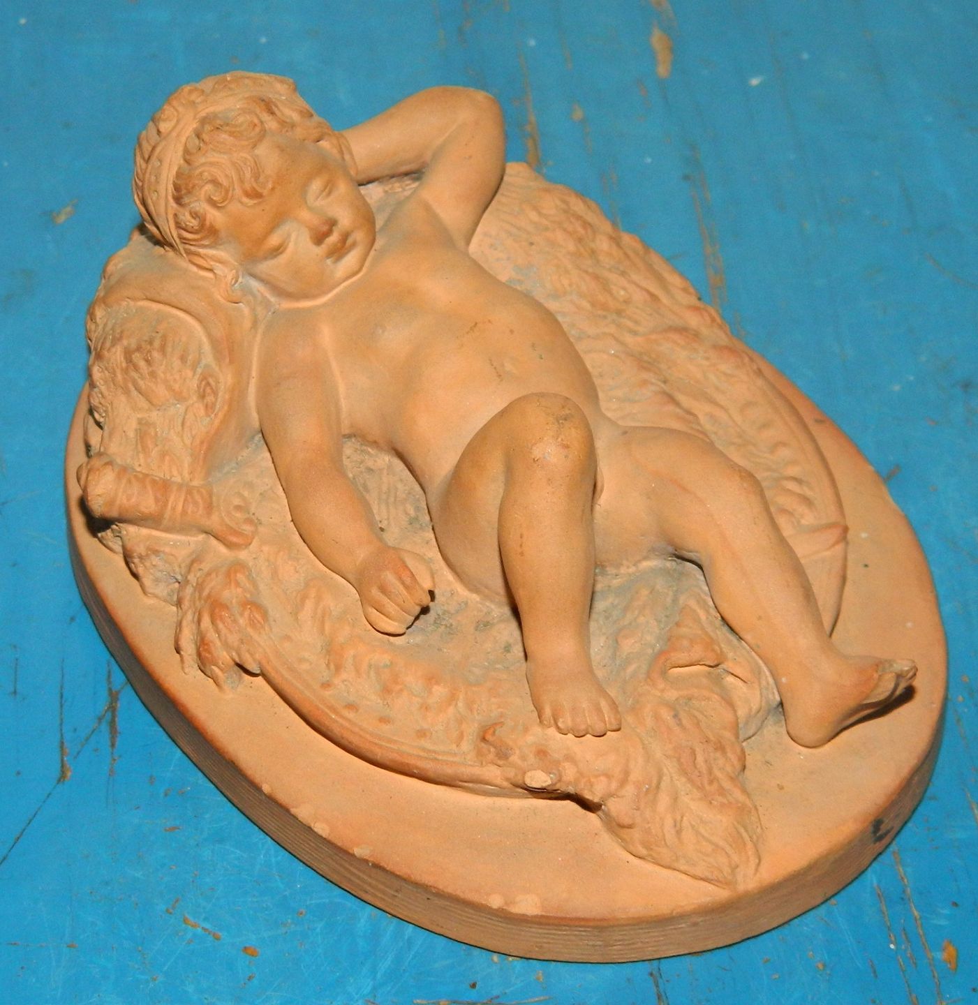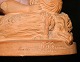 Figure in terracotta from Peter Ipsen, Copenhagen, of a sleeping boy. Has some small chips on the edges, looking at photographs and chipping on the left elbow. Factory marks on the bottom. 5 cm high and 11 cm long.