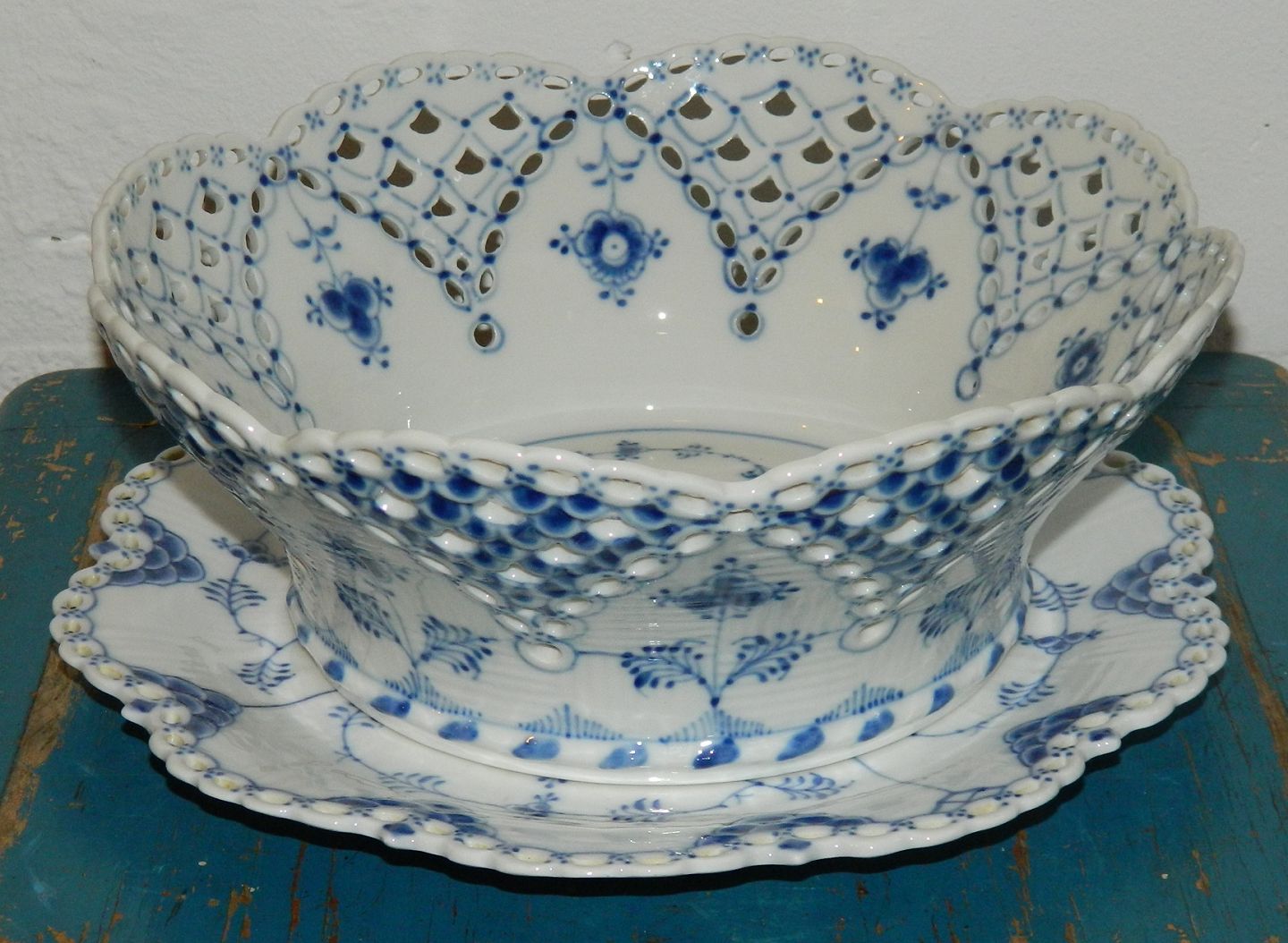 Kgl. helblonde musselmalet frugtskål i porcelæn med tilhørende underfad i