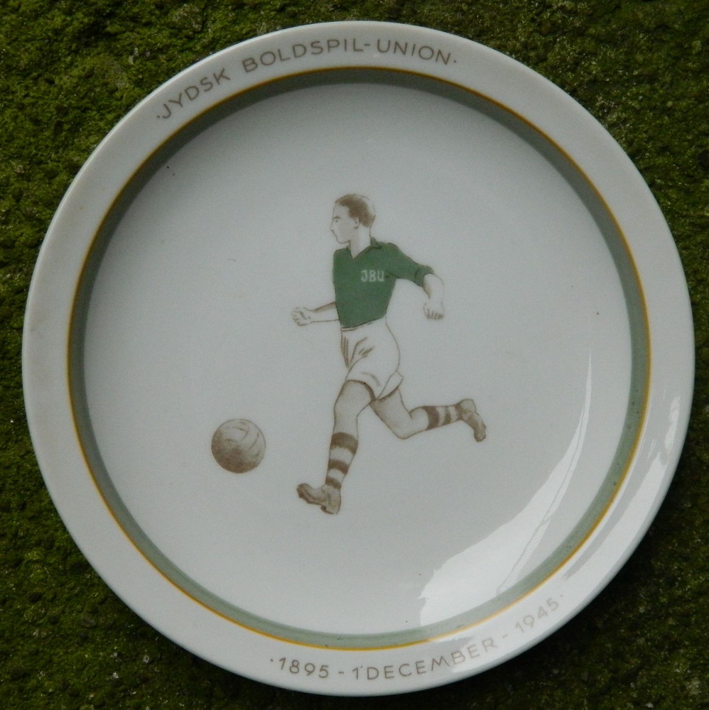Erindringsplatte fra Royal Copenhagen: Jydsk Boldspil-Union (nuværende DBU Jylland) 50 års jubilæum i 1945. Platten fremstår i god stand uden skader eller reparationer. 1. sortering. Fabriksmærket på bagsiden. 17 cm i diameter.
