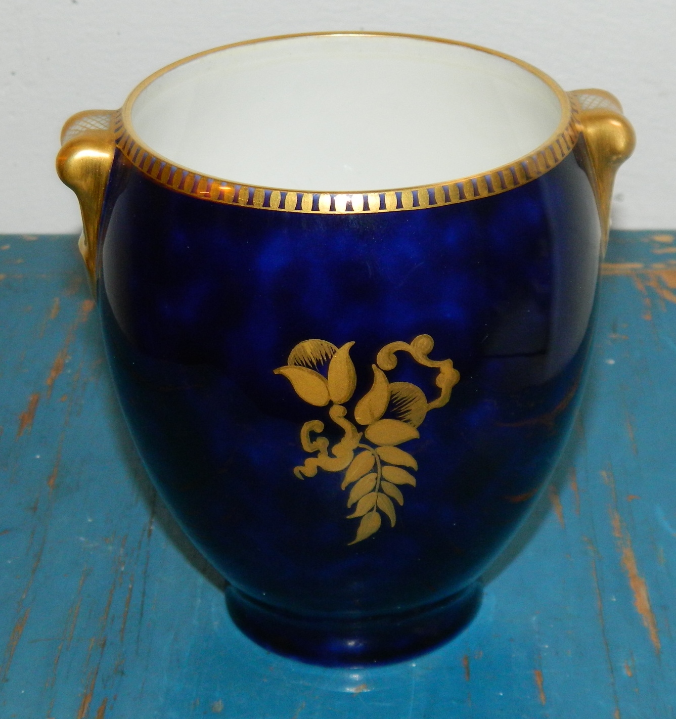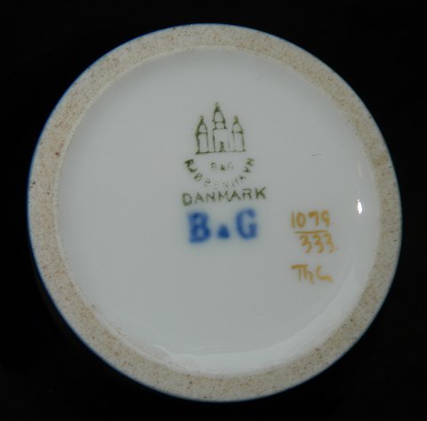Blå og guldbemalet krukke fra Bing & Grøndahl fra begyndelsen af 20. århundrede. Formoder at der har været låg til denne krukke ! Fremstår i god stand uden skader eller reparationer. Fabriksmærket på bunden. 12½ cm høj