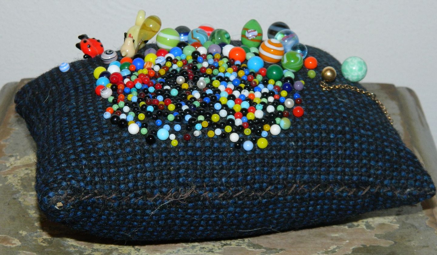 Pude med nipsenåle. Puden er 7½ cm høj - derudover måler den 13 cm x 17 cm.