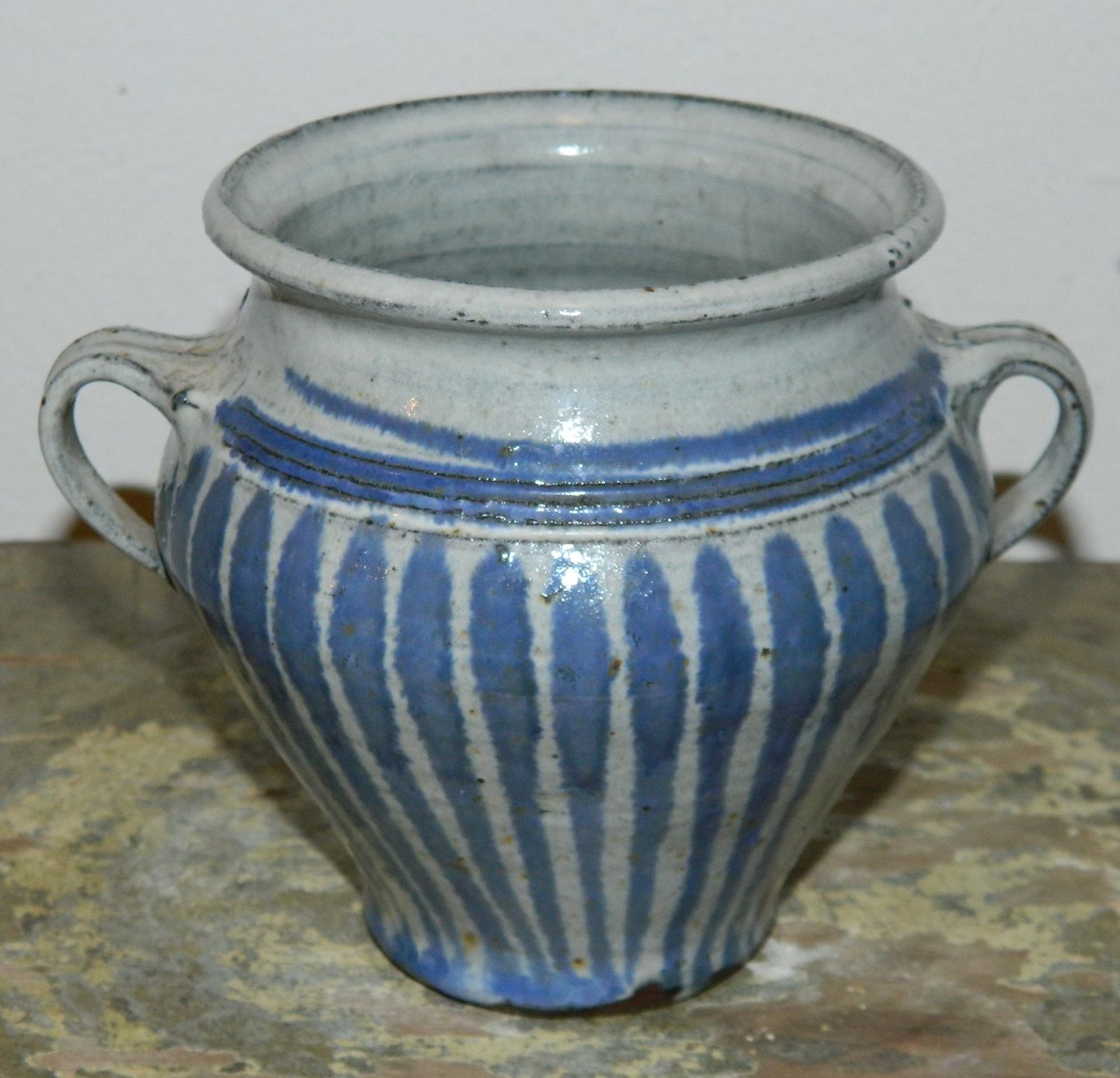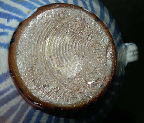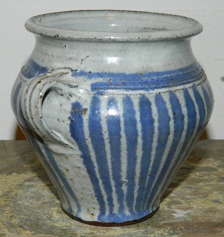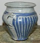 Krukke med ørehanke af Gutte Eriksen. Dekoreret med lange blå vertikale "tunger" - rundt om krukken. Ingen skader eller reparationer. Kunstnersignatur Gutte DANMARK på bunden. Krukken er 11 cm høj.