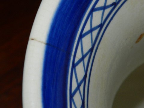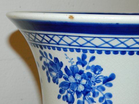 Vase i fajance fra Aluminia med Eremitage-dekoration fra omkring 1920. Fremstår i god stand med almindeligt brugssslid. Herunder mindre hårrevne på kanten (se både indvendigt og udvendigt) samt meget lille glasurafslag på kanten (se foto). Fabriksmærket på bunden med EREMITAGE KØBENHAVN samt svagt indstemplet ALUMINIA. Vasen er 28½ cm høj.