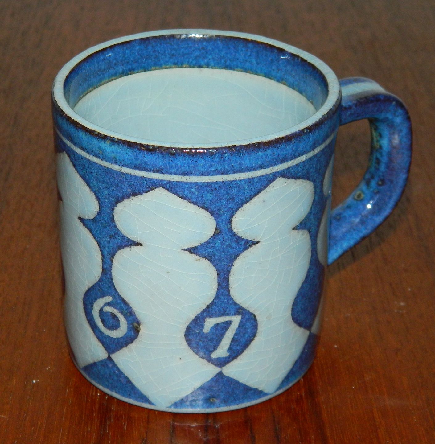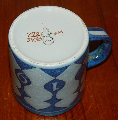 Første årskrus i den mindste model fra 1967. Fremstillet for Aluminia. 1. sortering. Fremstår i god stand uden skader eller reparationer. Krakkeleret som det fremgår af fotografierne. Fabriksmærket på bunden sammen med kunstnersignatur NT for Nils Thorsson. 7½ cm højt