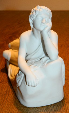 Figur i bisquit af liggende yngling. Modelleret af Bertel Thorvaldsen i Rom 1821-22. Denne reproduktion udført hos Bing & Grøndahl i slutningen af 19. århundrede. Figuren hører til figurfrisen (ses over Vor Frue Kirke´s indgangsparti) "Johannes Døberens prædiken". Fremstår i perfekt stand. Fabriksmærket på bagsiden af basen med B&G samt ENERET. 26 cm lang og 14 cm høj.