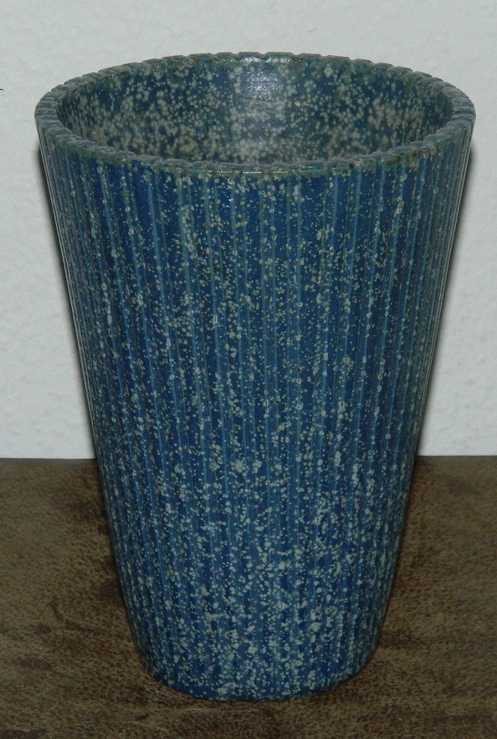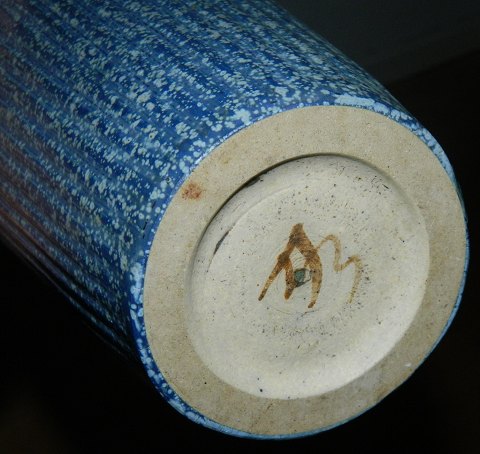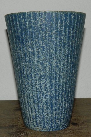 LIGNENDE KØBES: Arne Bang vase i keramik med vertikale ribber fra 1940´erne. Dekoreret i en blå og grønlig glasur både indvendigt og udvendigt. Fremstår i god stand med almindeligt brugsslid. Ingen skader eller reparationer. Fabriksmærket på bunden med kunstnersignatur AB. Intet modelnummer ! Vasen er lidt mere end 19 cm høj og 13½ cm i toppens yder diameter.