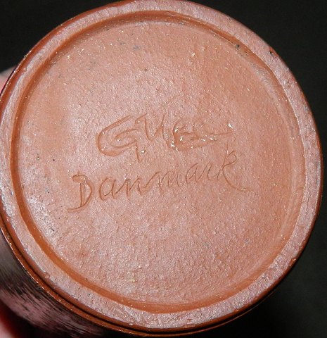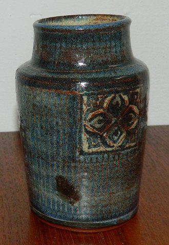 Vase i keramik af Gudrun Meedom (1915-2011). Dækket af blålig glasur. Dekoration i kvadrat på to sider ! Fremstår i god stand uden skader eller reparationer. Mørk blå glasurfejl ses på siden (se foto). Signeret af kunstneren på bunden. Vasen er 13 cm høj.