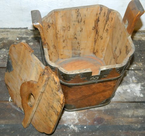 Madspand i rodtræ (tejne) med metaldekoration. I god stand. Fra slutningen af 19. århundrede. Formodes fremstillet i Skandinavien. 24½ cm høj.