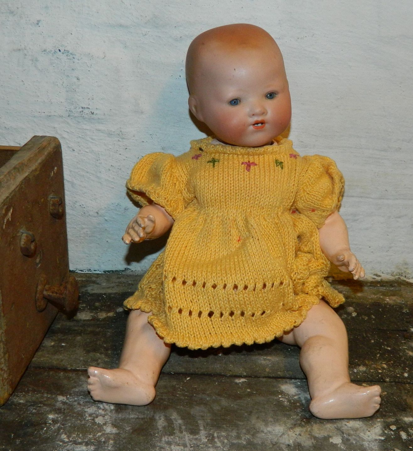 Dukke med porcelænshoved: Armand Marseille Germany - Nakken stemplet A. M. GERMANY 361. Fremstår i perfekt stand. Ingen skader eller reparationer. Dukken er 35 cm lang.