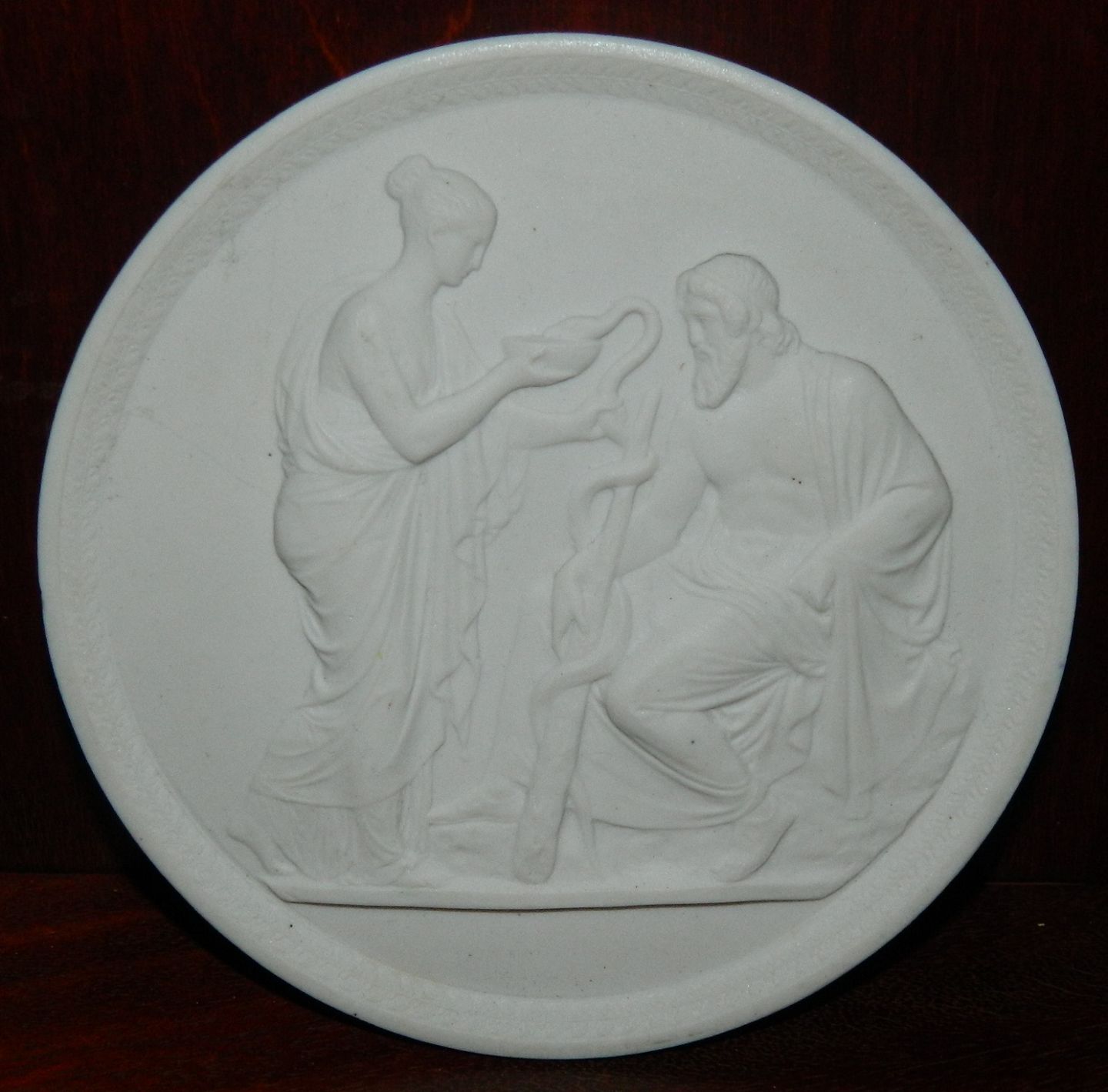 Royal Copenhagen platte i bisquit af Bertel Thorvaldsen (1770-1844) med "Herkules modtager udødelighedens drik af Hebe" ("Styrke"). Efter relief modelleret i Rom 1808. Platten fremstår i perfekt stand. Fabriksmærket på bagsiden. Fremstillet i slutningen af 19. århundrede. 14½ cm i diameter.