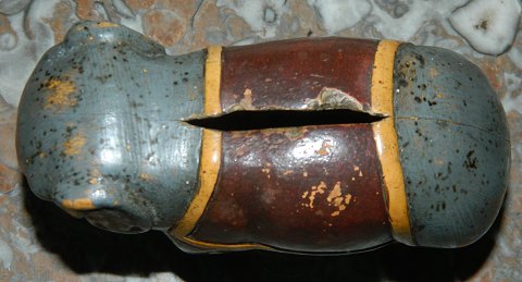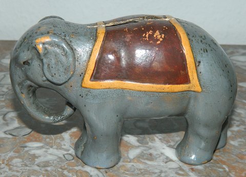 Bemalet figur af elefant som sparebøsse fra 1930´erne. Fremstår i god stand med nogen brugsslid - hvilket fremgår af billederne. Ingen afslag - bortset fra et par små afslag ved åbningen - eller alvorlige skader eller reparationer. 9 cm høj og 13 cm lang.
