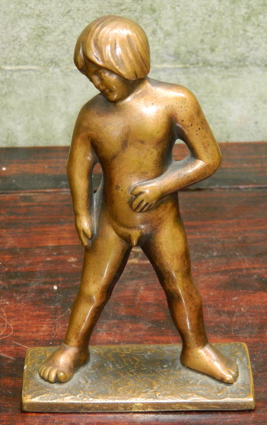Figur i bronze af nøgen dreng. Fremstår i god stand uden skader eller reparationer. Formoder den er fremstillet omkring 1930. Soklen stemplet BERNAT samt BRONZE. 11½ cm høj.