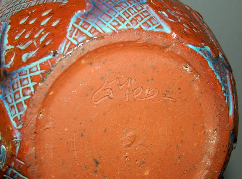 Vase i keramik af Gudrun Meedom (1915-2011). Dekoreret med stime af fladfisk i relief. Herpå delvist dækket af blålig glasur. Fremstår i perfekt stand uden skader eller reparationer. Vasen er 13 cm høj og bredest diameter på 15 cm. Åbningsdiameter på 9 cm. Signeret af kunstneren på bunden med indridset GMee.