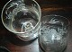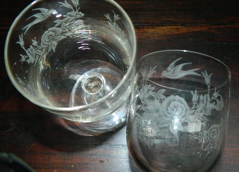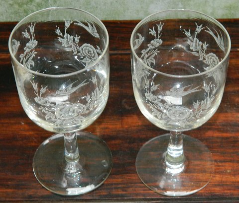 Par gamle glas med ætset dekoration med "fugle" fra Kastrup Glasværk fremstillet ca. 1910. Begge glas i god stand uden skader eller reparationer. Dekorationen ligeledes i flot stand uden brugsslid. Begge glas er "kugleslebne" på undersiden. 16 cm høje.