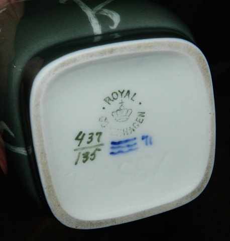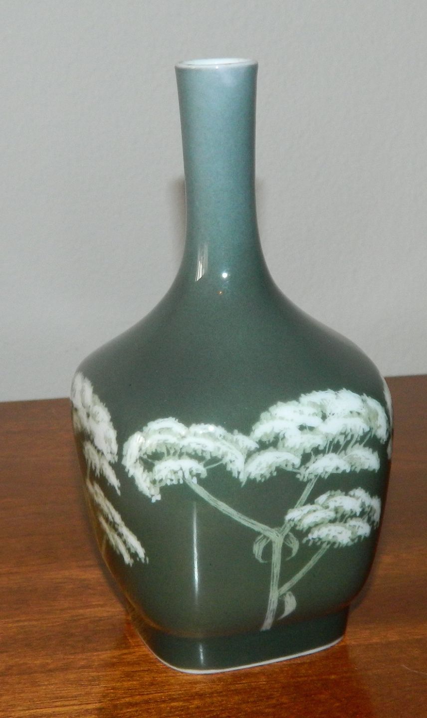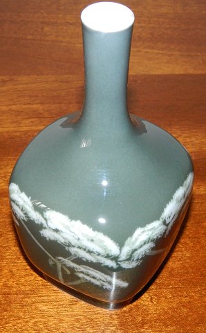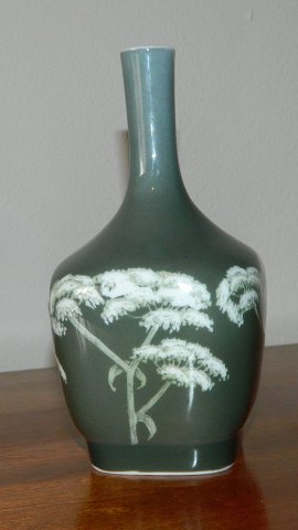 Skønvirkestil: Vase i grøn glasur med dekoration af hvide skærmplanter. Fremstillet for Royal Copenhagen mellem 1900-1923. Fremstår i perfekt stand. 1. sortering. Fabriksmærket på bunden. 16,5 cm høj