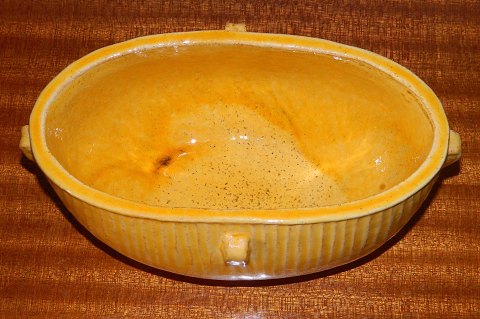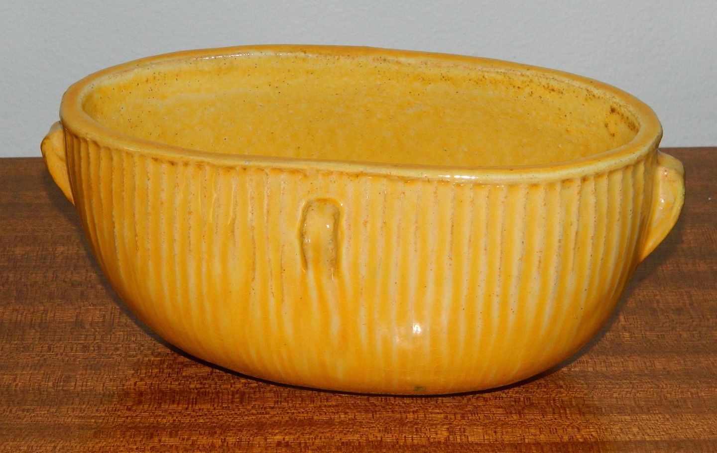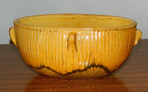Skål eller jadiniere i keramik designet af Svend Hammershøi. Dækket af gul glasur med sorte stænk. Derudover dekoreret med fire små ører. Fremstår i perfekt stand. Fabriksmærket på bunden med HAK samt DANMARK. Mål: L.: 21,5 cm H.: 9,5 cm, samt 12 cm dyb.