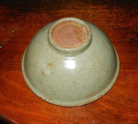 Skål i keramik fra Kina 17.-18. århundrede. Dækket af celadonglasur såvel indvendigt som udvendigt. Utydelig dekoration i bunden. Uden skader eller reparationer. 7,5 cm høj samt 15,5 cm i åbningens diameter.