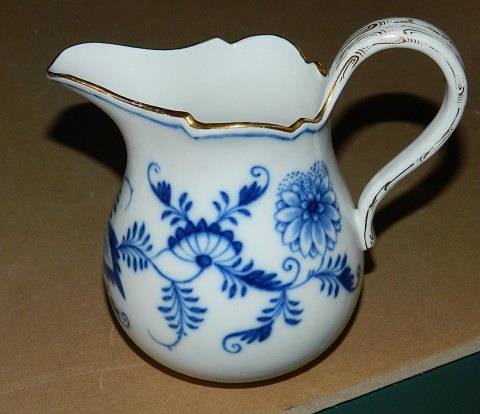 Fløde eller mælkekande i porcelæn med høj hank fra Meissen, Tyskland, ca. 1900. Dekoreret med løgmønster samt guldstaffering. Fremstår i god stand uden skader eller reparationer. Fabriksmærket på bunden. 14 cm høj