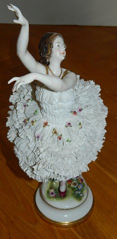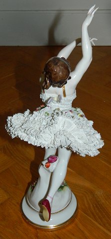 Figur i fajance af baletdanserinde med vinger og skørt i krenoline. Smådeffekter her og der på skørt. Ingen alvorlige afslag. Øvrige dele af figuren i god stand uden skader eller reparationer. Fabriksmærket på bunden. Formodes at være fremstillet i Tyskland omkring 1920. 35 cm høj.