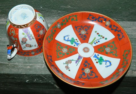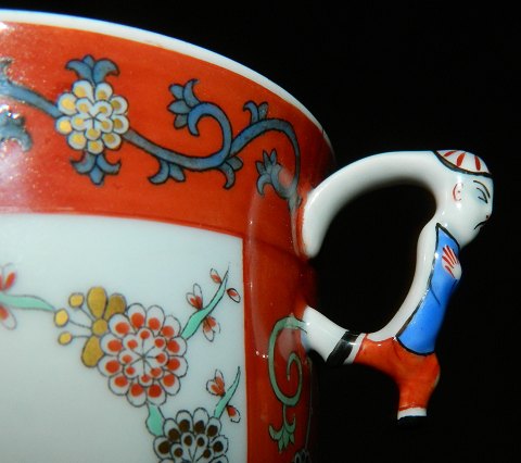 Porcelæn fra Ungarn: Stor kop og underkop fra den ungarnske porcelænsfabrik Herend. Kinesisk tema og dekorationer. "Kinamand" som hank. Hanken har en revne - muligvis fabriksfejl ! Både kop og underkop smukt dekoreret med gennembrudt fod. Koppen er 8 cm høj. Begge dele fabriksmærket. Underkoppen er 3½ cm høj og 17 cm i diameter.