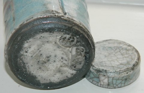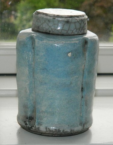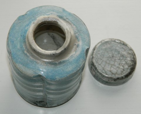 Bojan in raku decorated in blue by Inger Rokkjær. Traces of two smaller areas with missing glaze. In a small "dot" a lack of missing glaze on the bojan (also seen in photo). No damage or repairs. Bojanen is 11 cm high incl. lid.
