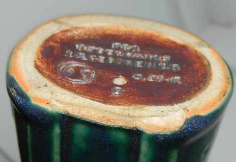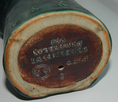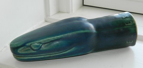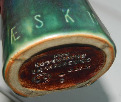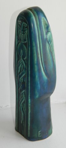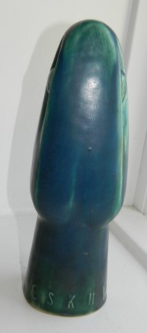 Figur af Æskulap i stentøj fra Saxbo fabrikken ca. 1955. Designet af Olaf Sæhr-Nielsen (1896-1969). Fremstillet som gaveartikel for Københavns Lægeforening, hvilket fremgår af stemplingen på bunden. Det vides ikke hvor mange figurer der er fremstillet. Dækket af en grøn "hare-pels" glasur. Formen udgør samtidigt hovedet på en slange. Fabriksmærket på bunden, modelnummer samt kunstnersignatur O. St.N. hertil FRA KØBENHAVNS LÆGEFORENING. Figuren har et par småskår på undersiden. 22 cm høj.