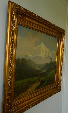 Stort maleri på lærred. Motiv med landskab samt bjerge. Fremstår i god stand. Kraftig guldramme i træ. Ingen signatur. Ingen skader eller reparationer. Mål: 94½ cm x 123 cm