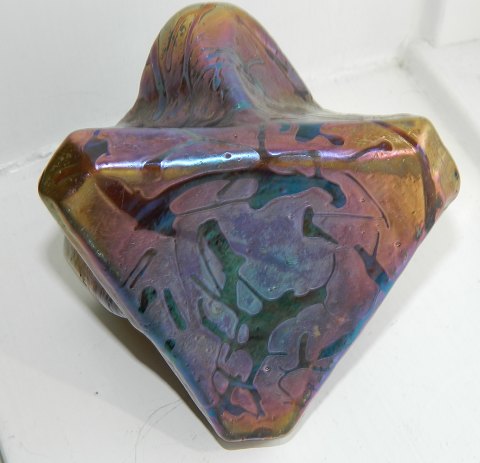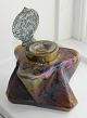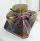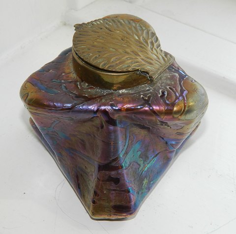 Art Nouveau: Blækhus i glas (grøn, blå, lilla, guld) med messing montering med låg fra Loetz eller Palme König. Fremstillet omkring 1910. I perfekt stand. Ingen skader eller reparationer. Mål: 8½ cm høj - Bunden måler 10½ cm på hver af de tre sider på bunden.