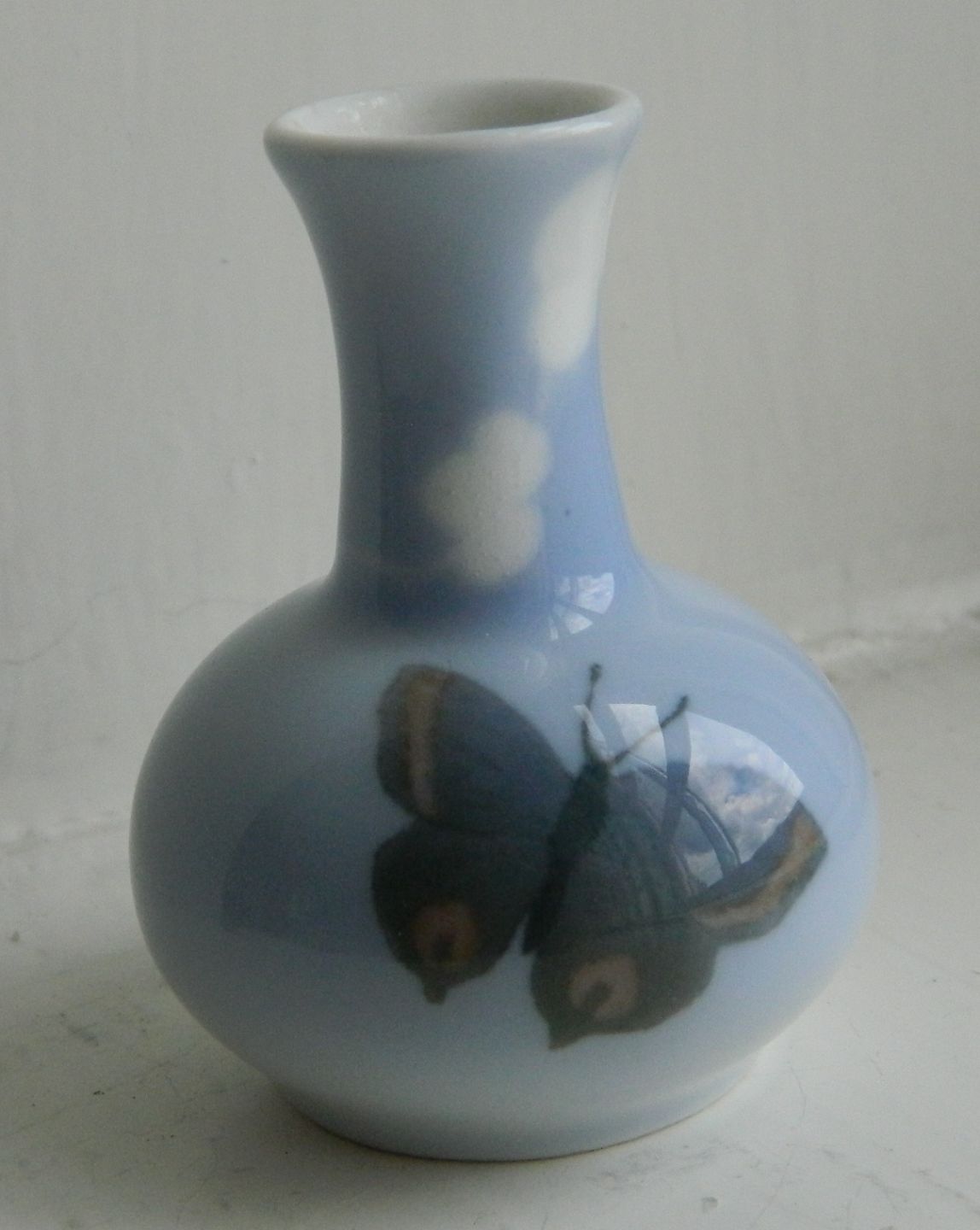 Miniature vase i porcelæn fra Royal Copenhagen. Fremstillet mellem 1900-23. Fremstår i perfekt stand. 1. sortering. Dekoreret med sommerfugl. Fabriksmærket på bunden. 6 cm høj.